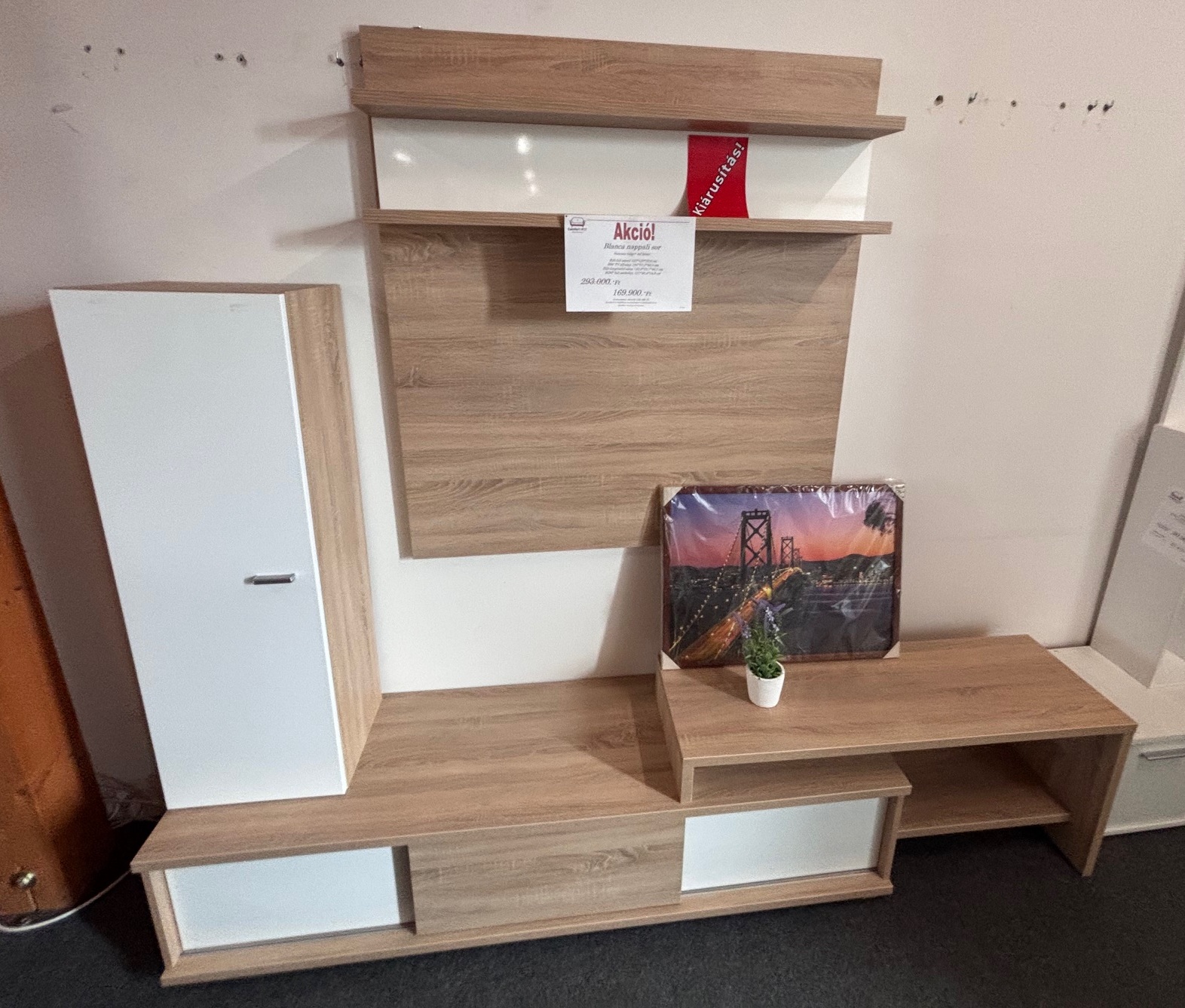 A szett tartalmaz 2 falra szerelhető elemet (egy polcos falipanelt és egy zárt szekrényt), és egy alsó TV-s szekrényt, oldalsó polccal kiegészítve.