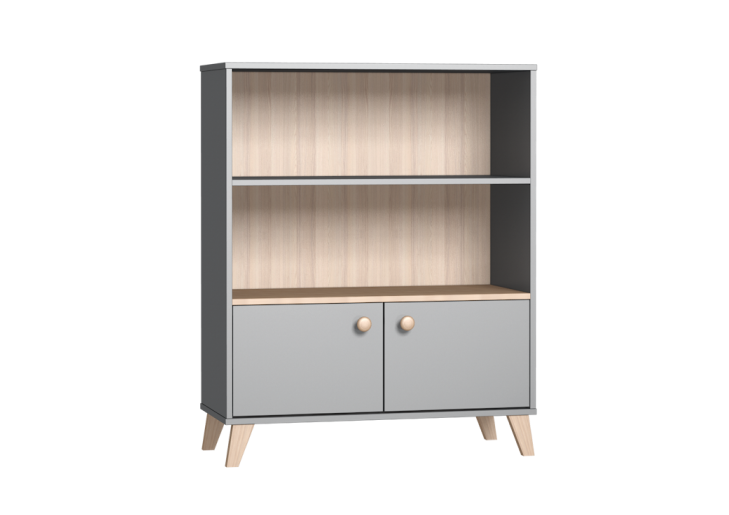 Divatos szürke és sonoma tölgy komód, felül 2 nyitott polccal, alul kis szekrény szekcióval.
