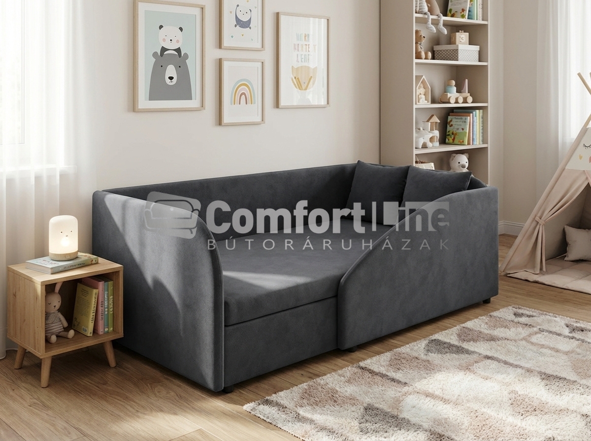 Praktikus, magyar gyártású gyerekágy ágyneműtartóval, amely kényelmes fekvőfelületet biztosít, és segít rendet tartani a szobában. Széles szövet- és színválasztékból rendelhető, így könnyen a meglévő berendezéshez igazítható.