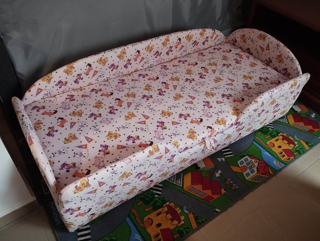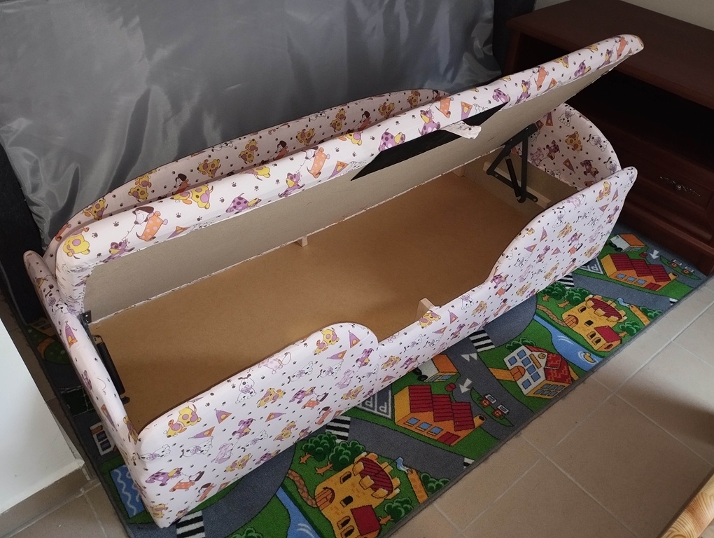 Vidám stílusú mintás gyerekágy szivacsos fekvőfelülettel, szövet kárpitozással és praktikus ágyneműtartóval – kedvező áron!