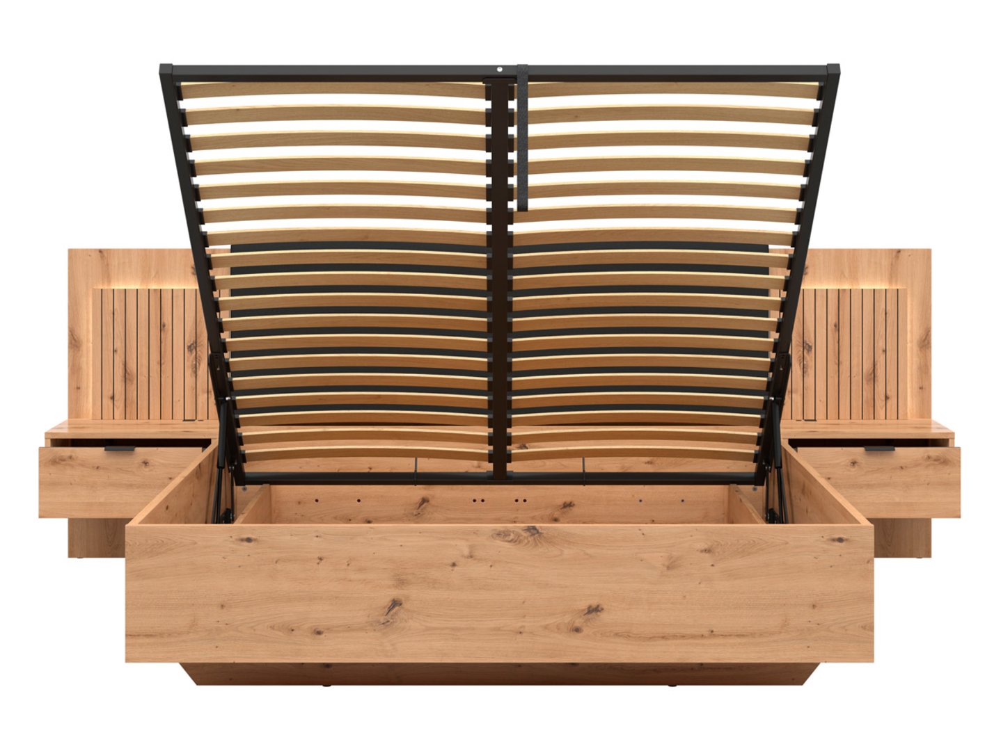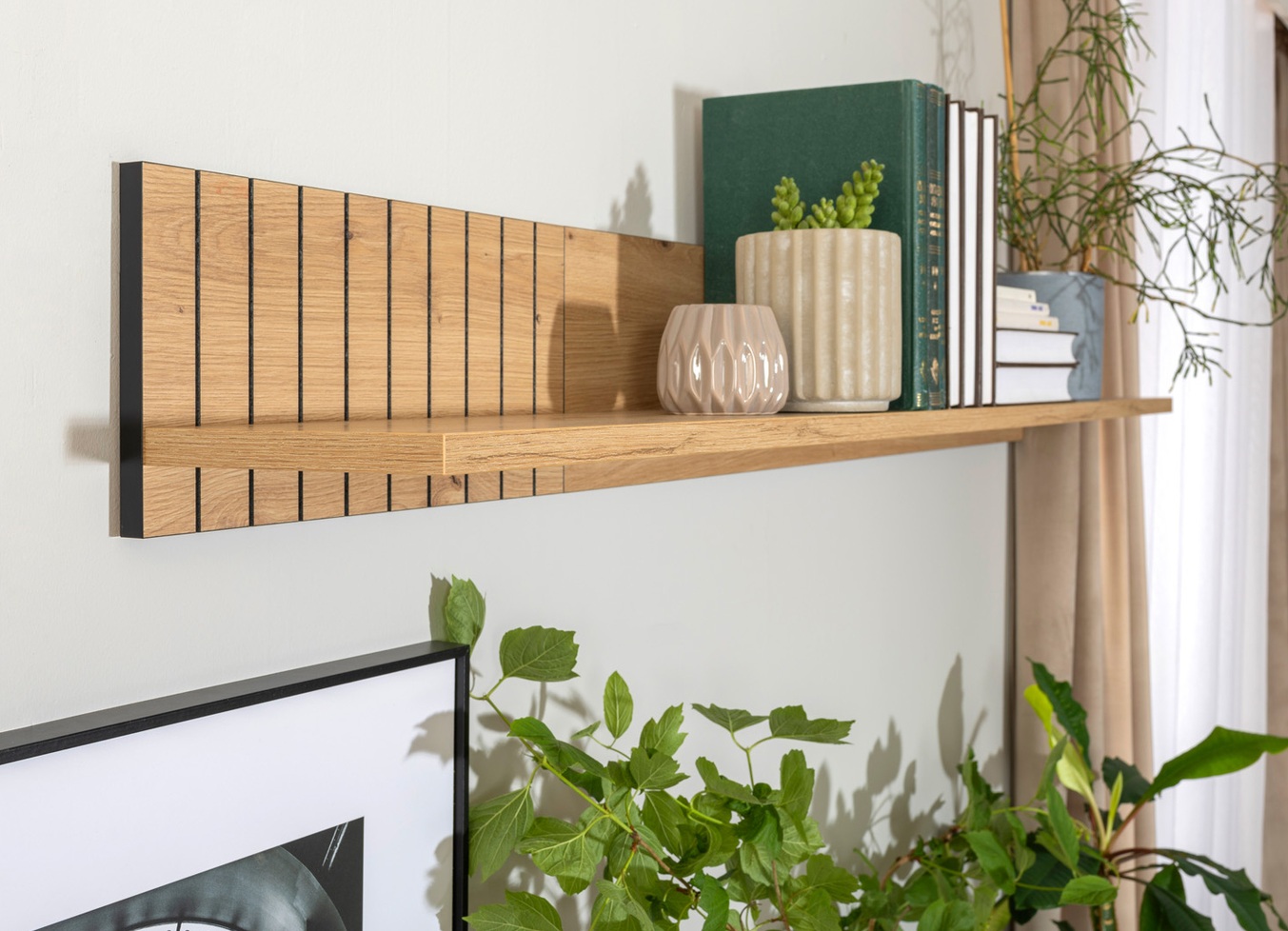 Különleges, lamellás jellegű – azaz függőlegesen 3D mart – kollekció. Magas, karakteres fekete lábakon állnak a bútorelemek.