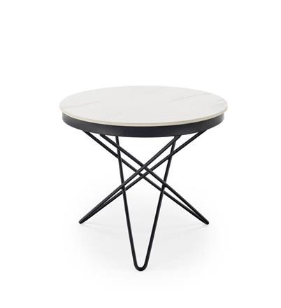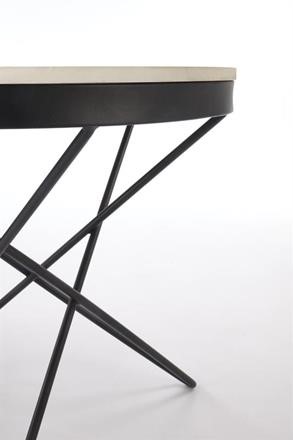 Modern, loft hangulatú kerek dohányzóasztal fekete fém lábbal és fehér márványhatású lappal.