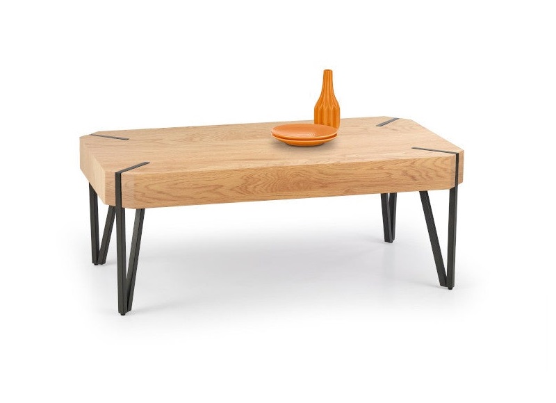 Rusztikus hatású dohányzóasztal, mely MDF asztallapból és fekete, porszórt acél lábakból épül fel.