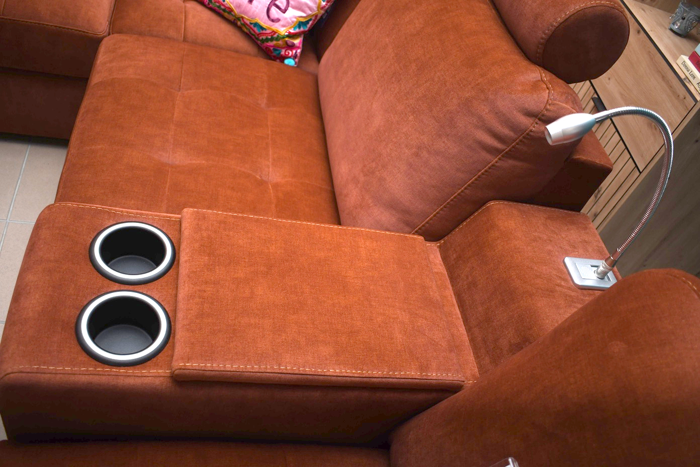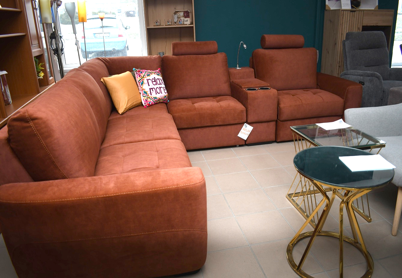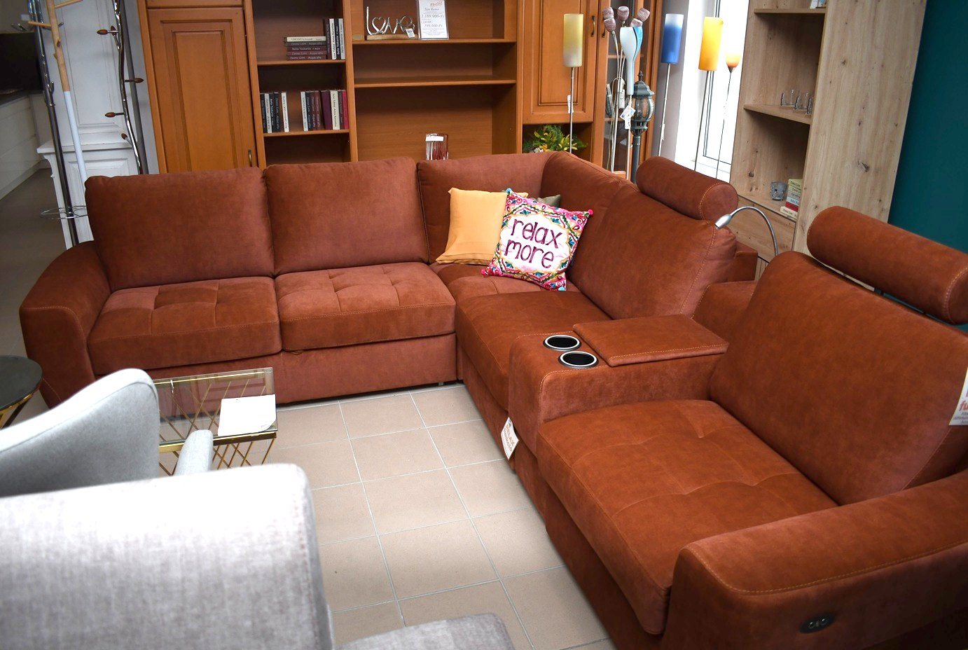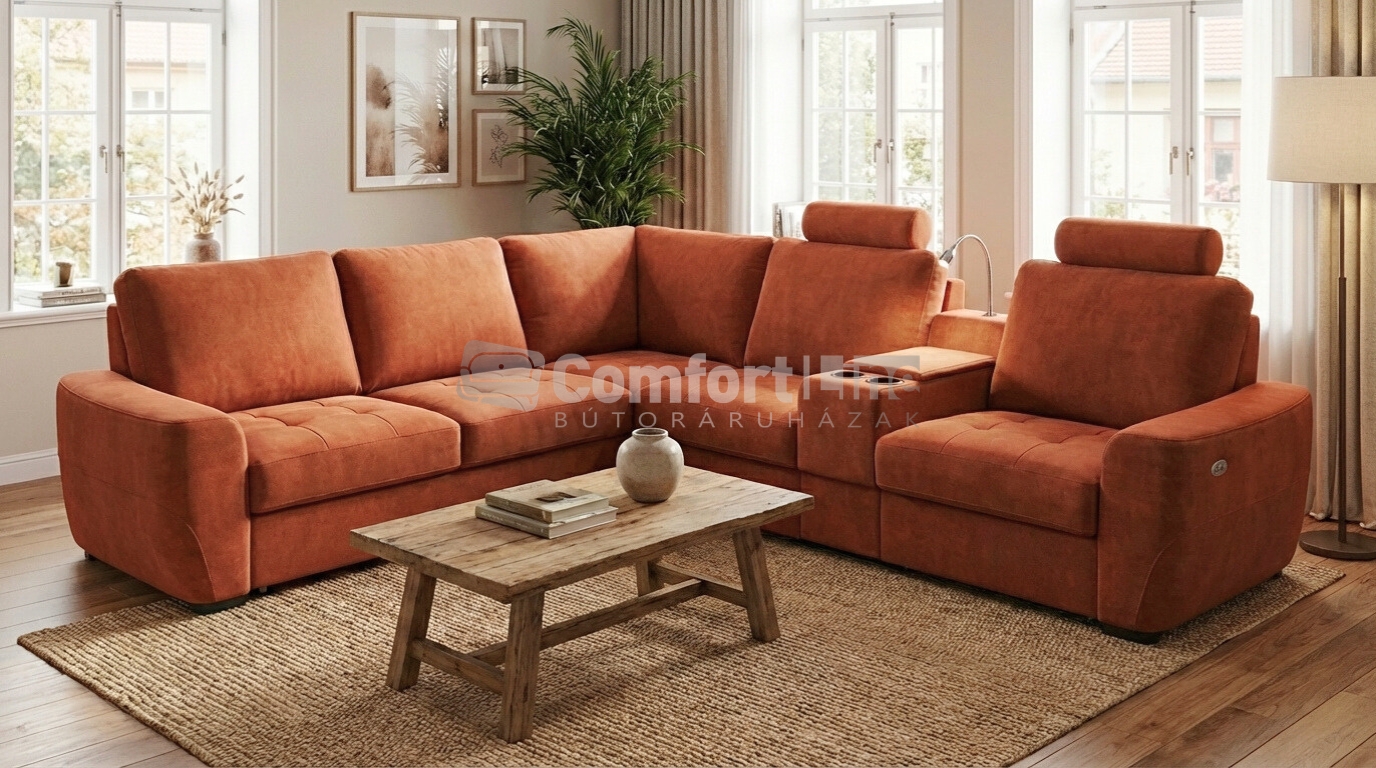 MONTE CARLO prémium sarokgarnitúra, egyedi és meleg terra színárnyalatban, elektromos RELAX funkcióval.