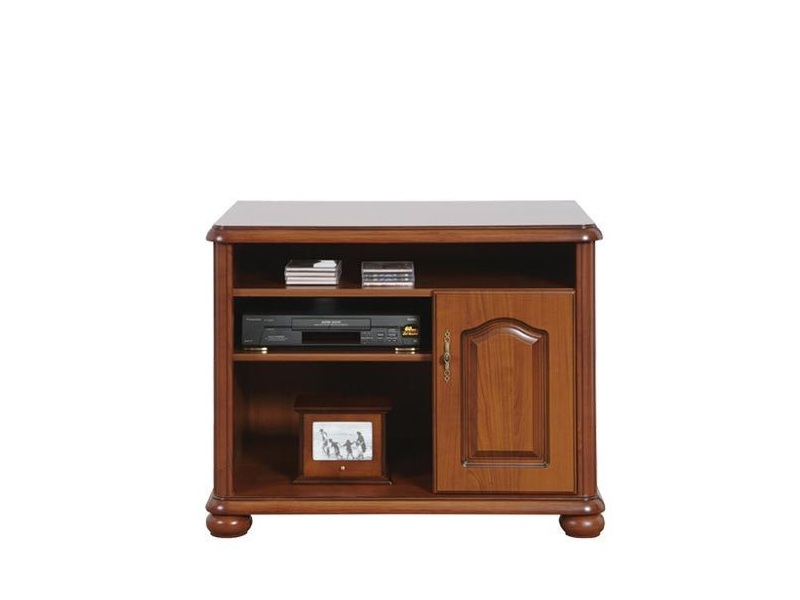 Funkcionális, egyajtós TV-szekrény három nyitott rekesszel elektronikai eszközök számára. Klasszikus megjelenés, elegáns marású fronttal, fém fogantyúval (patinás sárgréz). Fa lábak.