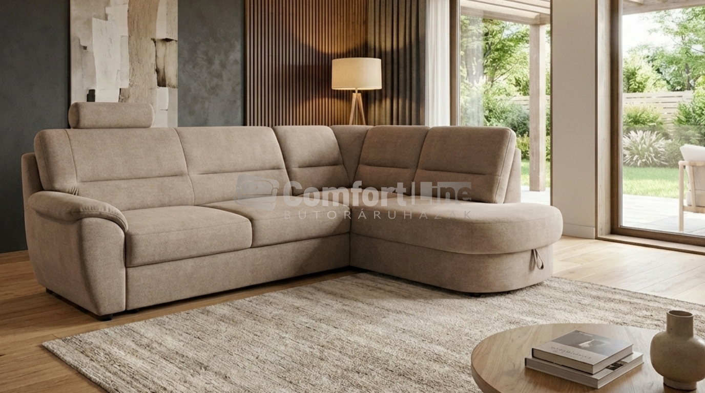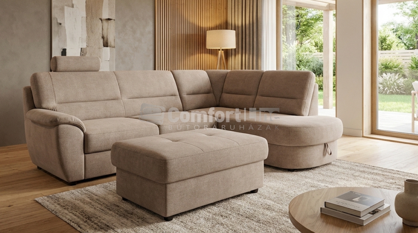 Moduláris ülőgarnitúra, így tetszőleges összeállításban kérhető. A legnépszerűbb „L” alakú sarok verzióban, így ágyneműtartós és ágyazható, illetve fotel is kérhető hozzá.