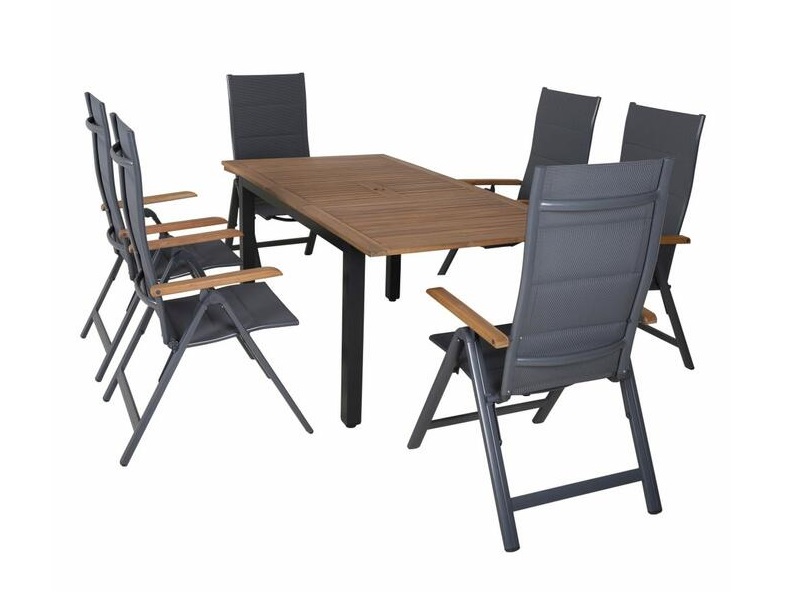 Prémium minőségű, modern megjelenésű kombinált kerti bútor szett, mely 6 db állítható székből és asztalból áll. Anyaga alumínium profil, komaxit kezeléssel, mutatós akácfával kiegészítve. Az asztal szintén alumínium profilból és akácfából készült, kihúzható.